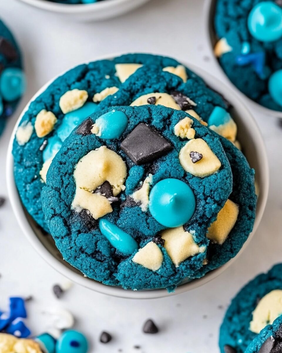 Blue Cookie Monster Cookies are a whimsical and visually striking treat that can brighten any occasion. Bursting with vibrant blue hues and studded with colorful candy pieces, these cookies are not only a feast for the eyes but also a delightful experience for your taste buds. The unique blue color comes from food coloring or blue candy, which captures the essence of the beloved Cookie Monster character from Sesame Street. Each bite reveals a soft and chewy texture, with a perfect balance of sweetness and flavor that cookie lovers crave. This recipe combines classic cookie ingredients with a twist, making it a fun addition to any dessert table or party. Whether you are baking for a birthday celebration, a themed event, or simply to satisfy your sweet tooth, these cookies are sure to impress both kids and adults alike. The playful appearance, combined with a delicious flavor, makes Blue Cookie Monster Cookies a must-try for anyone who loves to bake and enjoy fun desserts.