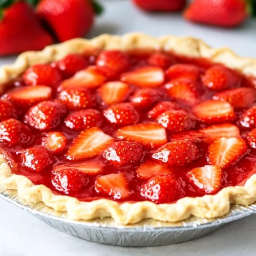 The Classic Homemade Strawberry Pie is a timeless dessert that brings the essence of summer into every bite. With a luscious filling of fresh strawberries enveloped in a buttery, flaky crust, this pie is a celebration of flavor and texture. Ideal for family gatherings, holiday celebrations, or simply as a treat after a weeknight meal, it is loved by both children and adults alike. The combination of sweet, ripe strawberries with a hint of tartness creates a delightful balance that is simply irresistible. Not only is this pie visually stunning with its vibrant red hue, but it also offers a comforting and nostalgic experience that evokes fond memories of picnics and summer days. This Classic Homemade Strawberry Pie is sure to impress your guests and family, making it a staple in any dessert repertoire.