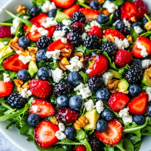 The Fresh Arugula Salad With Berries And Simple Vinaigrette is a vibrant dish that perfectly balances the peppery notes of arugula with the sweetness of fresh berries. This salad is not just a feast for the eyes; it’s a celebration of flavors that can brighten any meal. Ideal for weeknight dinners, family gatherings, or even festive occasions, this salad is sure to impress both guests and family alike. The standout qualities of this dish lie in its freshness, ease of preparation, and its ability to serve as a versatile side or a light main course. The combination of textures and flavors makes it a delightful addition to any table, ensuring that it appeals to a wide audience, from health enthusiasts to casual eaters.