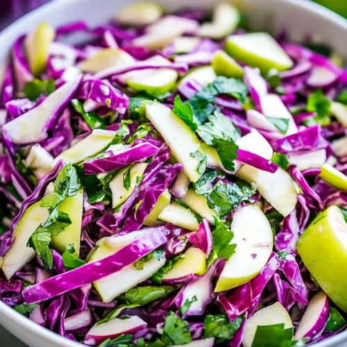 The Fresh Red Cabbage Salad With Apple and Almonds is a vibrant, crunchy dish that beautifully balances sweet and savory flavors. This salad is perfect for various occasions, from weeknight meals to family gatherings. The combination of crisp red cabbage, tart apples, and crunchy almonds creates a delightful texture that keeps every bite interesting. Not only is this salad visually appealing, but it also packs a nutritional punch, making it ideal for health-conscious individuals and families looking to incorporate more vegetables into their diets. The standout qualities of this salad lie in its refreshing flavor profile and versatility, allowing it to be served as a side dish or a light meal. Enjoy it alongside grilled chicken or fish for a satisfying dinner or as a standalone dish during lunch.