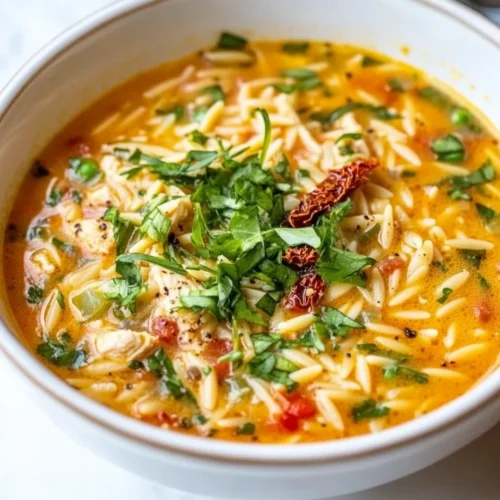 Hearty Chicken Orzo Soup With Sun-Dried Tomatoes is a comforting dish that brings warmth and flavor to your table. This delightful soup combines tender chicken, creamy orzo pasta, and the rich, tangy essence of sun-dried tomatoes, creating a bowl of goodness that is perfect for cozy evenings. Ideal for weeknight meals or family gatherings, this soup caters to all ages, making it a wonderful choice for everyone. The robust flavors meld beautifully, and the addition of vegetables enhances both the texture and nutritional profile. Whether it’s a chilly day or a quick dinner solution, Hearty Chicken Orzo Soup With Sun-Dried Tomatoes is sure to satisfy and impress.