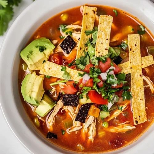 - When ready to serve, ladle the hot soup into bowls. Top each bowl with crispy tortilla strips, diced avocado, and chopped cilantro for a burst of freshness.