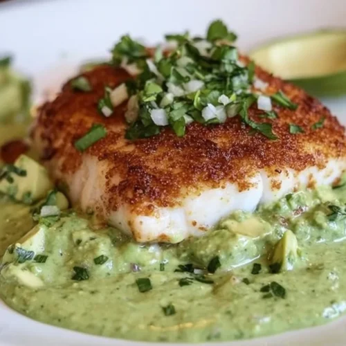 There are numerous reasons to adore this Pan-Seared Cod With Creamy Avocado Sauce. First, the dish is remarkably easy to prepare. With minimal ingredients and straightforward steps, even novice cooks can create a restaurant-quality meal in the comfort of their own kitchen. The cooking method used for the cod ensures that it remains moist and flaky while achieving a beautiful golden crust, making it visually appealing on the plate. The creamy avocado sauce is another highlight, providing a healthy fat source that enhances the dish’s richness without overwhelming the palate. Additionally, this recipe is incredibly versatile; it can be served with various sides, such as rice, quinoa, or a fresh salad, allowing for endless variations to suit different preferences. Finally, the combination of textures—from the crispy exterior of the cod to the smooth creaminess of the avocado sauce—creates a delightful eating experience that will leave your guests wanting more.