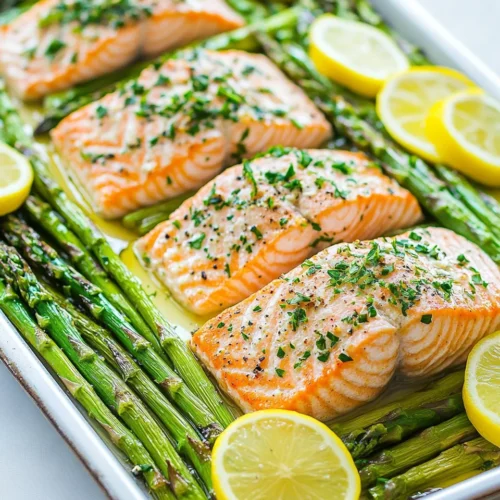 Sheet Pan Salmon With Fresh Asparagus is a culinary masterpiece that combines the rich, buttery flavor of salmon with the crisp, vibrant taste of fresh asparagus. This dish is perfect for weeknight meals, family gatherings, or any occasion where you want to impress without spending hours in the kitchen. The salmon, when roasted, develops a delightful crust while remaining tender and flaky inside, and the asparagus adds a fresh crunch that balances the dish beautifully. The simplicity of cooking everything on a single sheet pan makes cleanup a breeze, making it a go-to recipe for busy home cooks. This dish appeals to a wide audience, from health-conscious eaters to busy families, all seeking a quick yet satisfying meal that does not compromise on flavor or nutrition.